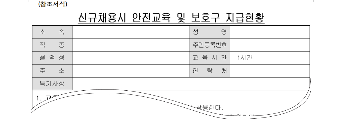 신규채용시 안전교육및 보호구지급현황
