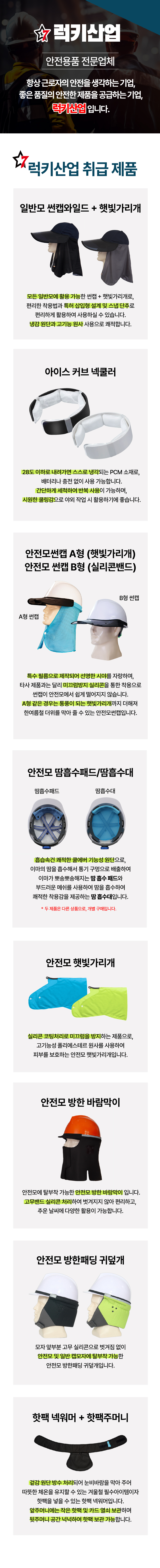 안전을 생각하는 기업, 럭키산업입니다. [럭키산업 취급품목] 1) 일반모 와이드썬캡 햇빛가리개 (LK-009) 2) 아이스 커브 넥쿨러 3) 안전모썬캡 A형, B형 4) 안전모 햇빛가리개 5) 안전모 땀흡수패드 (LK-201) 6) 안전모 땀받이 땀흡수대 (LK-101) 7) 안전모 방한패딩 귀덮개 (LK-006) 8) 핫팩 넥워머 + 핫팩 주머니 9) 안전모 방한 바람막이 (LK-008) 언제나 저희 럭키산업 제품을 이용해 주신 고객 여러분께 감사 드립니다. 항상 근로자의 안전을 생각하는 기업, 더욱더 품질 좋고 안전한 제품들을 공급하는 기업이 되겠습니다. 감사합니다. - 럭키산업 - |