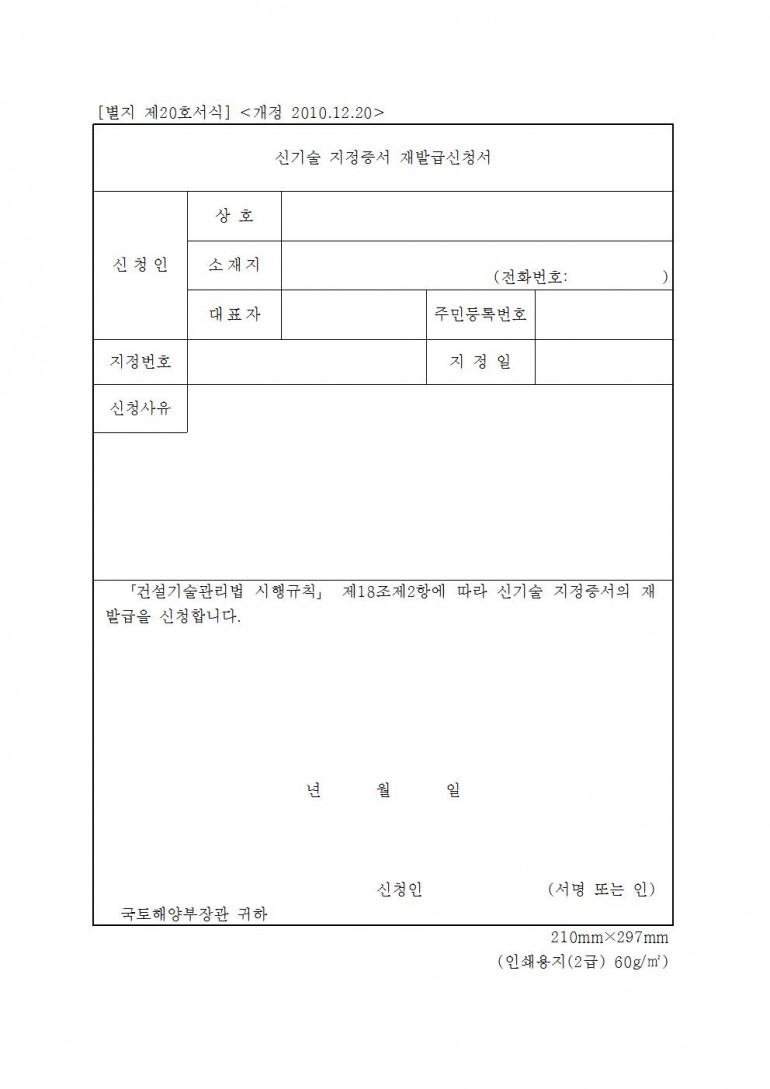 신기술 지정증서 재발급신청서