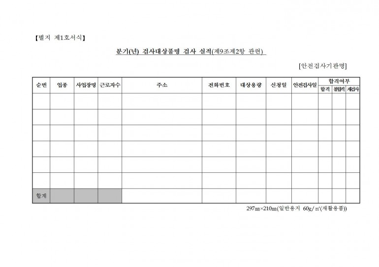 산업안전보건법행정규칙-안전검사 절차에 관한 고시[서식1]분기년 검사대상품명 검사 실적제9조제2항 관련.hwp
