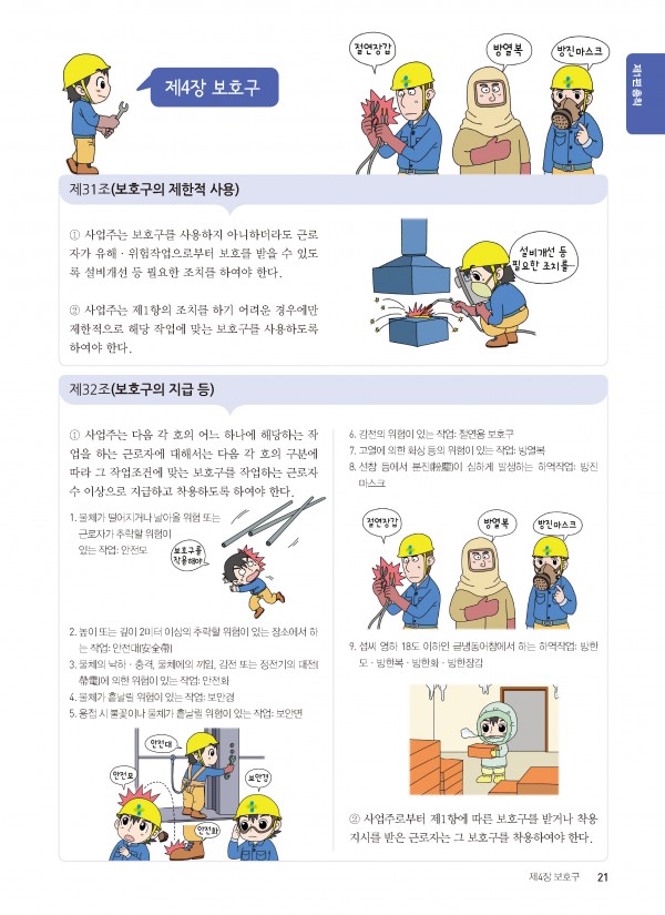 [산업안전보건기준에관한규칙] 제1편(총칙) - 제3장 통로 : 제21조~제30조 페이지 정보 작성자 세이프넷 작성일16-12-30 09:38 조회3,562회 댓글0건 관련링크 이전글 다음글 목록 본문 제3장은 근로자의 안전과 재해예방을 위해 사업주가 설치하고 운영해야 할 '작업통로'에 대해 전반적인 규정을 하고 있습니다 - 제21조 : 통로의 조명 - 제22조 : 통로의 설치 - 제23조 : 가설통로의 구조 - 제24조 : 사다리식 통로 등의 구조 - 제25조 : 갱내통로 등의 위험 방지 - 제26조 : 계단의 강도 - 제27조 : 계단의 폭 - 제28조 : 계단참의 높이 - 제29조 : 천장의 높이 - 제30조 : 계단의 난간출처 : 안전보건공단 댓글목록 등록된 댓글이 없습니다. 이전글 다음글 목록